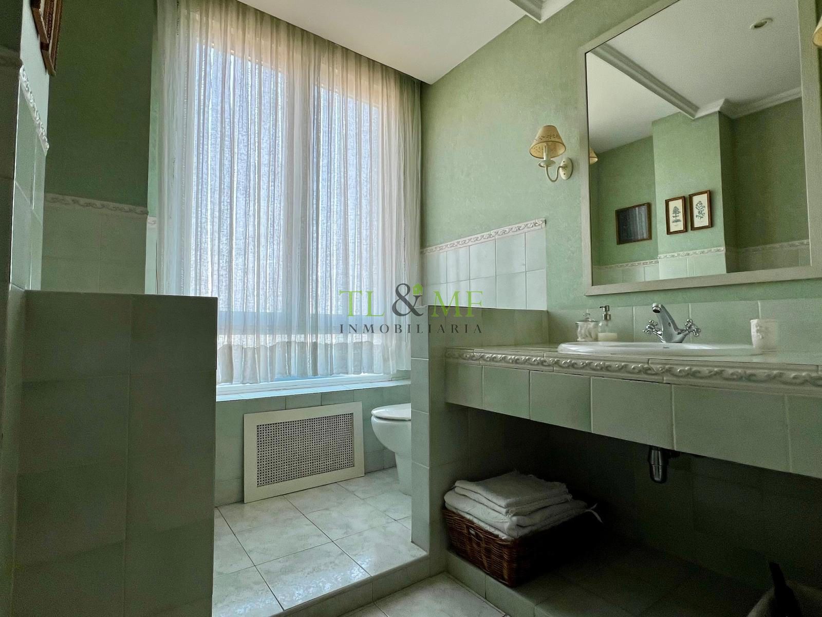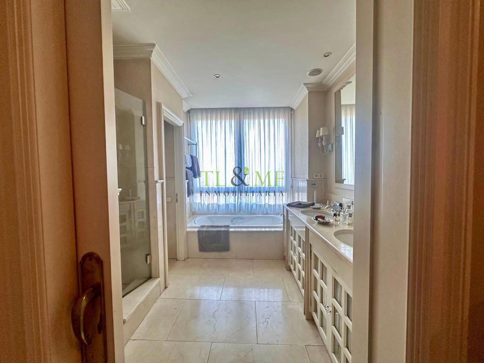 Gran dormitorio principal con zona de estar o despacho, multitud de armarios y cuarto de baño completo con dos lavabos, bañera y ducha.