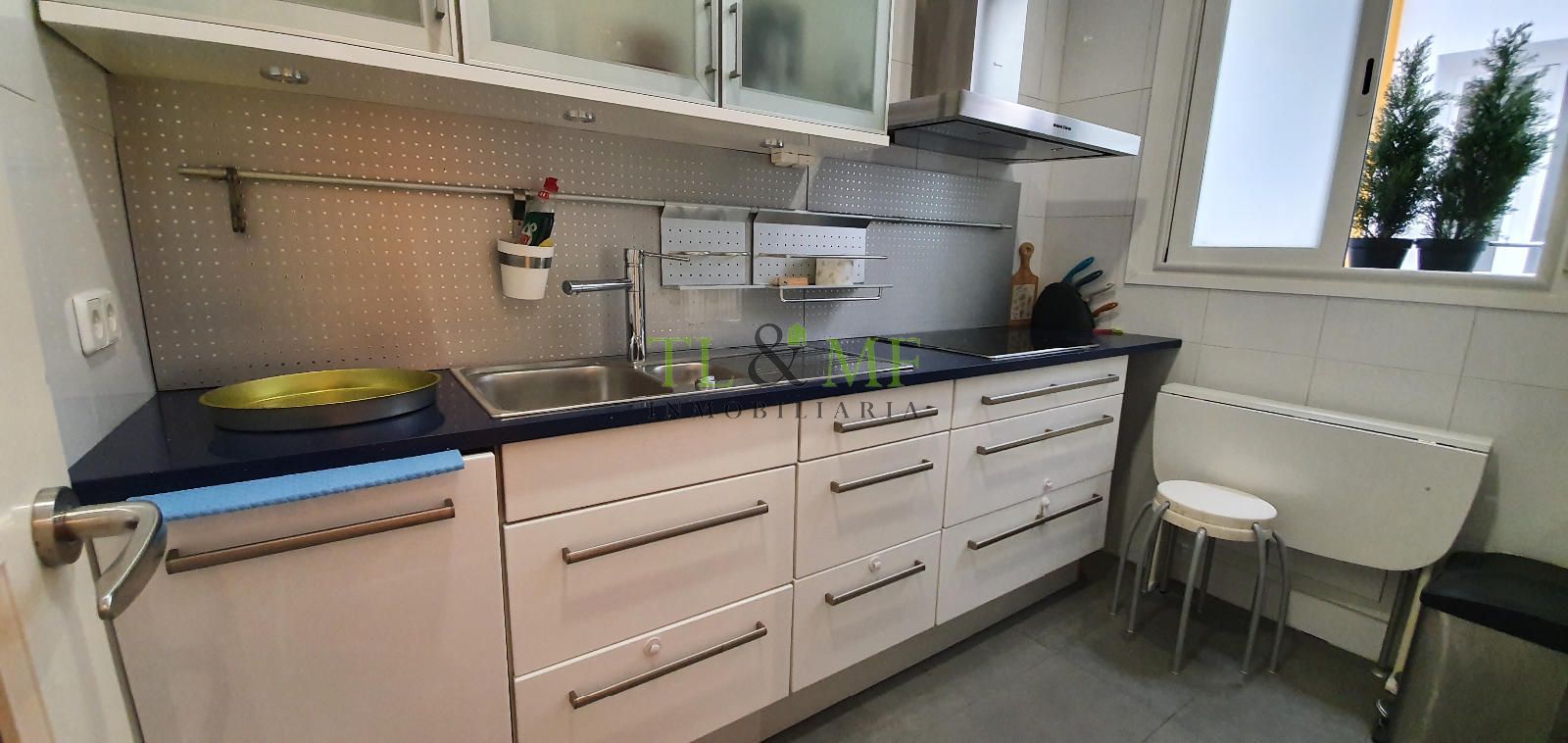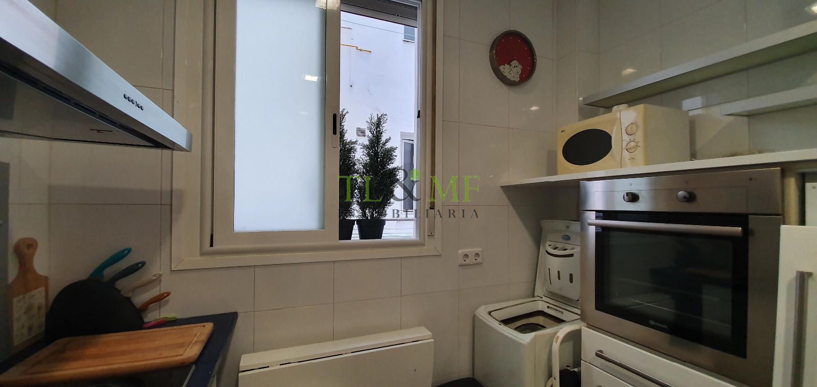 La cocina, también con ventana, está amueblada y equipada con todos los electrodomésticos: gran nevera, lavadora nueva, lavaplatos, horno, cocina vitrocerámica y campana extractora.