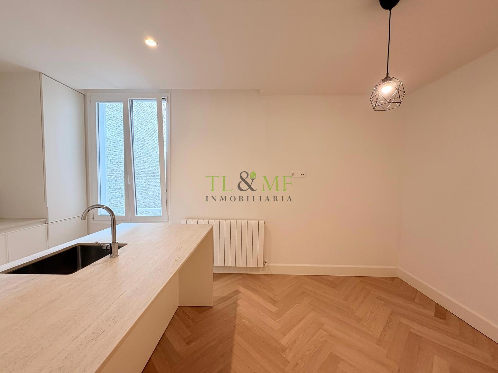 Al entrar, nos encontramos con un gran salón - comedor de más de 30 metros cuadrados. La reforma realizada incorpora una preciosa librería de obra y estanterías, que dan un toque diferencial y muy especial al salón. La cocina, independiente del salón y con luz natural, cuenta con un office - comedor y una zona de lavadero con lavadora y secadora. Gran ventana en la cocina, lo que proporciona ventilación propia.
